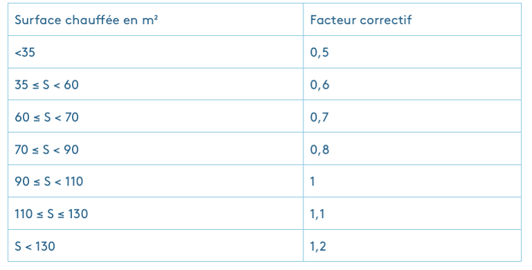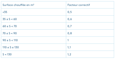 Les facteurs correctifs de surface susmentionnés dépendant de la surface chauffée du logement sont les suivants :